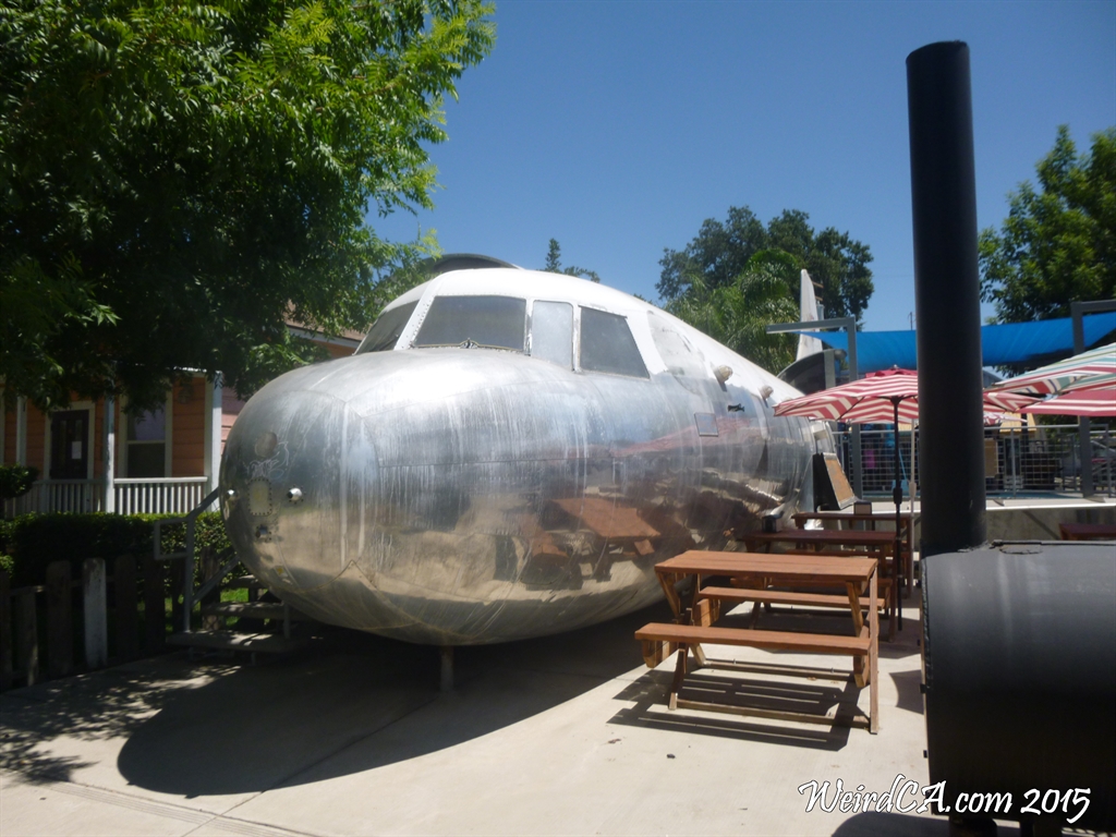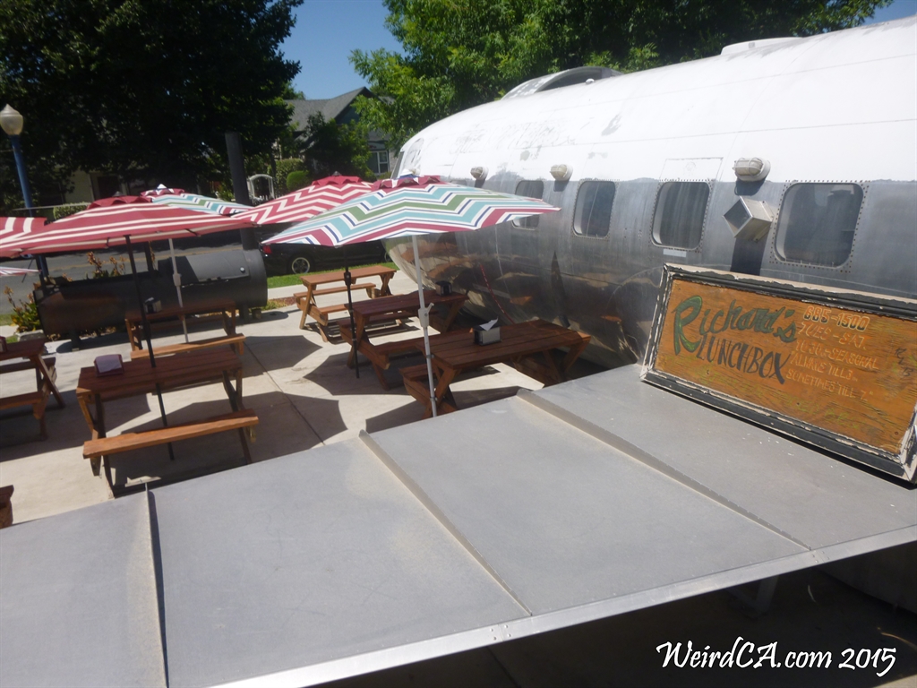 What do you do with an old 1951 Convair T-29 Air Force navigation training plane? Why turn it into a hot dog place, of course! At least that's what the folks of Aerodogs did in Tulare. Opened in 2006, Aerodogs was originally a hot dog eatery offering up a variety of styles of hot dogs. With a slogan of "Home of the Famous Flying Wiener", it had a colorful logo of a dog in aviation goggles with his tongue hanging out being and being blown back by the wind. It was sold in 2012, however, and became Tom's Smokin Barbecue. I'm guessing it changed hands again sometime in 2013 because now it is Richard's Lunchbox, and coincidentally doesn't sell hot dogs (or french fries) at all!
