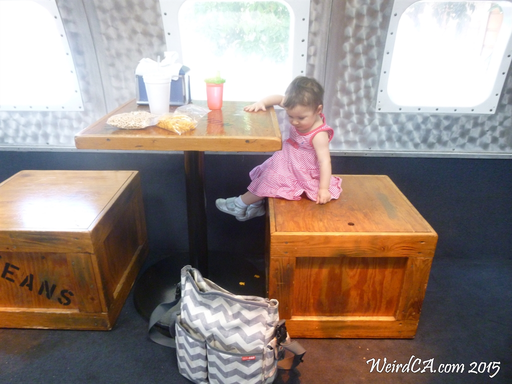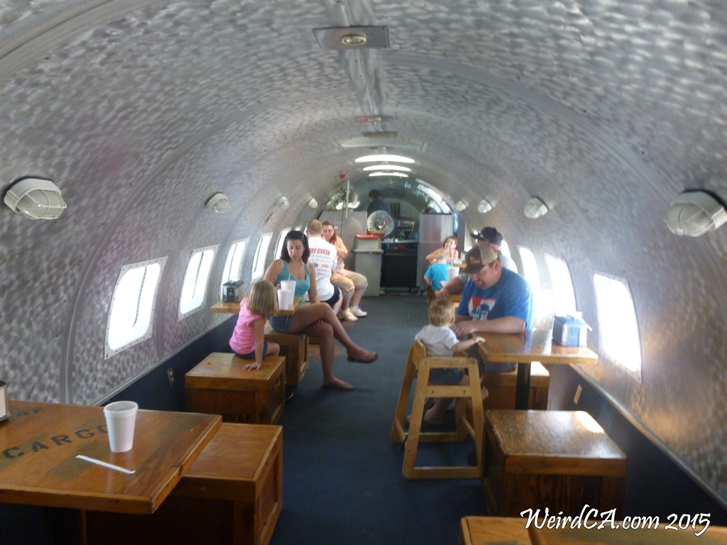 Richard's Lunchbox has both outdoor and indoor seating. Outdoor seating is at picnic tables around one of the wings. Indoor seating is actually inside the plane's fuselage on mock cargo crates. There is a counter at the back of the plane for ordering and most of the cooking is done back there as well. The plane only has one wing as the wing on the other side of the plane has been removed. However, there are fake clouds on the fence outside the windows on that side to "simulate" being in the air. A small hangar sits next to the plane and is used for larger parties and events. The cockpit is viewable from inside the plane and even has a dummy pilot sitting in one of the seats.