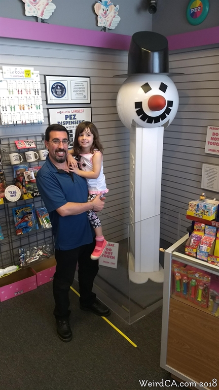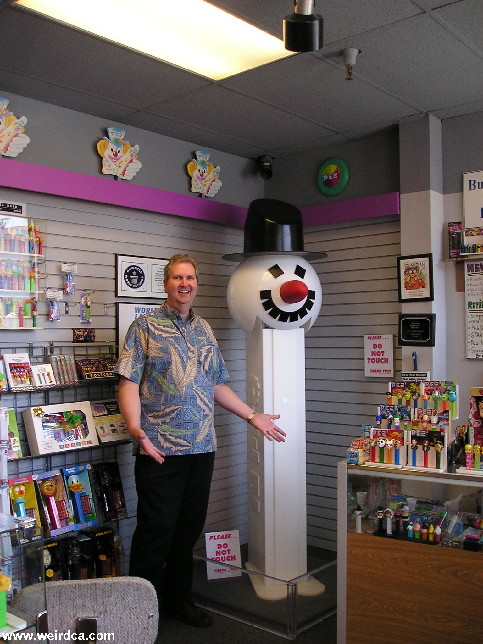 Sadly, the Burlingame giant snowman Pez dispenser is no longer the World's Largest. The new largest Pez dispenser resides in Orange, Connecticut. At the very end of 2011, the Pez Visitor's Center opened up with a twelve foot tall Pez dispenser and almost 6,000 square feet of Pez related attractions.